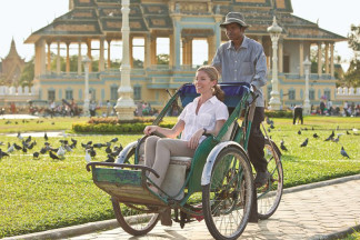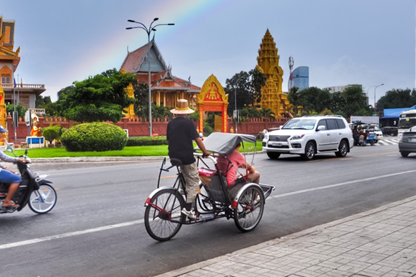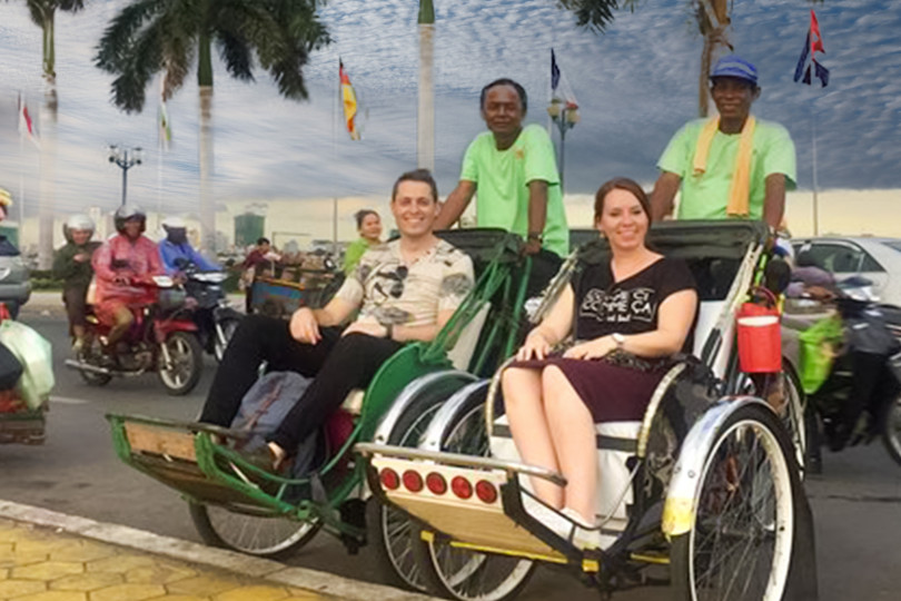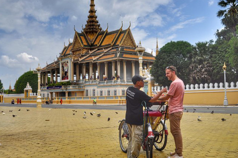 Traveling by Cyclo (a Cambodian bicycle-powered rickshaw) is a special way of experiencing the streets and buildings of the city. We enter some buildings and see others from the pavement, from the cyclo, as well as exploring by foot navigating through small alleyways.